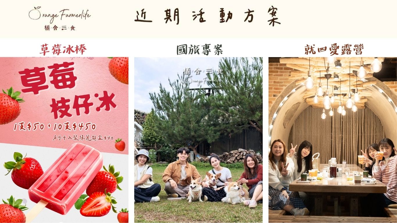 位於苗栗縣卓蘭鎮的壢西坪休閒農業區,海拔約五百公尺,曾經是日治時代的飛機場, 進而轉變成農村至休閒農業區;其中以柑橘園佔地最為廣大,平台上處處可見農人們為了儲放柑橘而搭建的屋子,即為柑倉『橘舍』,現在懷抱著感恩之心將這塊土地重新打造,感謝大地賜予的肥沃土壤及珍貴雨水,讓我們得以生活渡三餐『三食』。