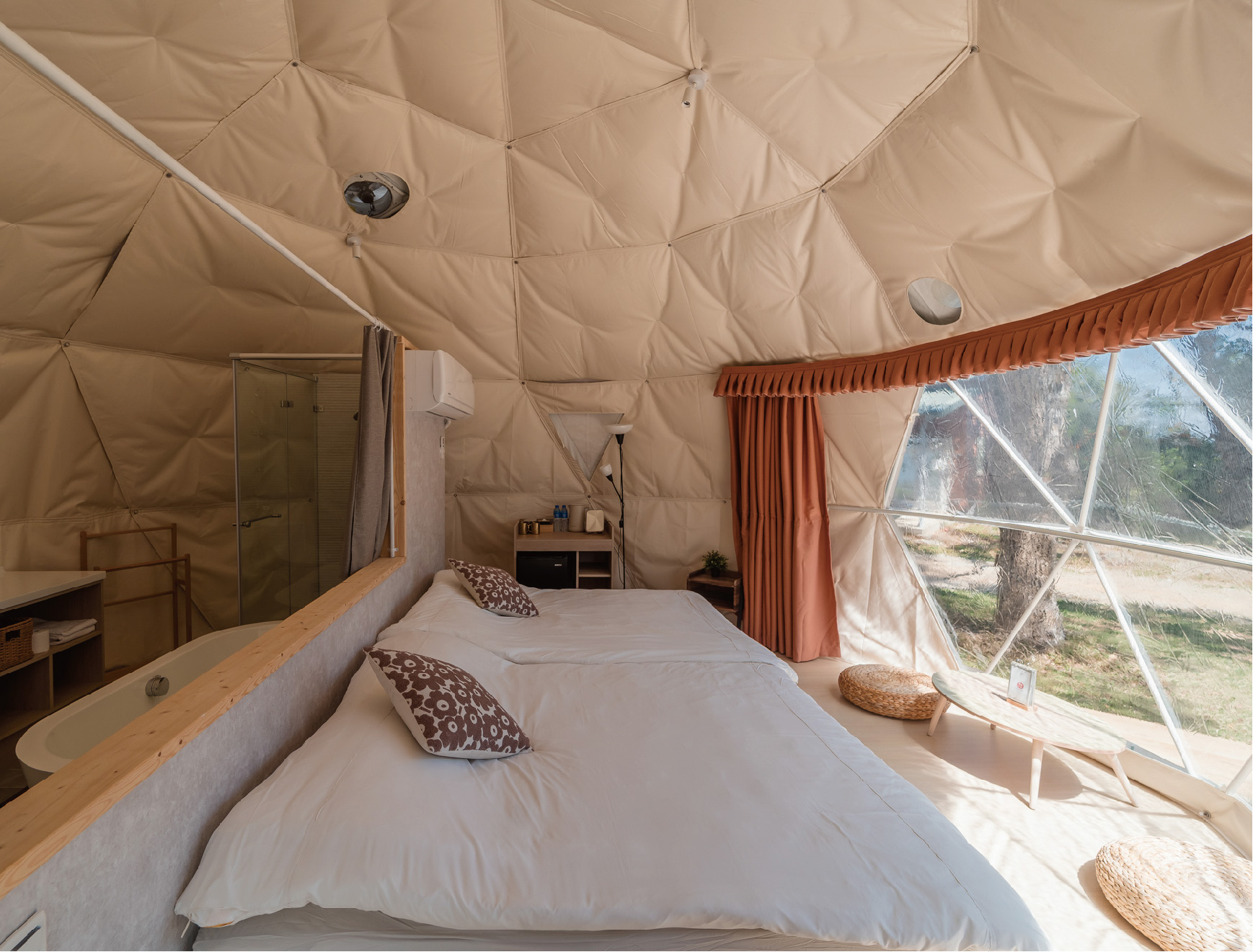 - 球型帳篷內含舒適雙人床兩張及乾濕分離衛浴(含浴缸),冷暖空調、冰箱、水壺、吹風機、鞋架、木製小桌、北歐風落地燈、除濕機、飲用水、衛生紙、沐浴乳、洗髮精等服務設施