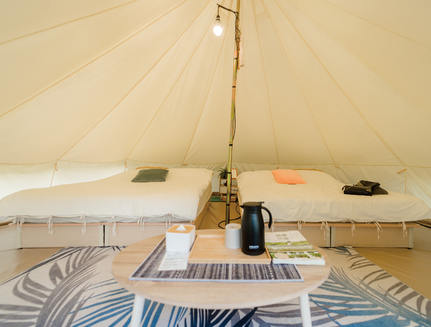 - 帳篷內含舒適雙人床兩張、鞋架、木製小桌、溫馨小夜燈、飲用水杯等
